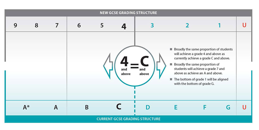 These 'new' GCSEs are graded 1 to 9, with 9 being the top grade. Below is a diagram produced by Ofqual indicating how the grading scale compares with the legacy GCSEs using the A*-G grading system.
