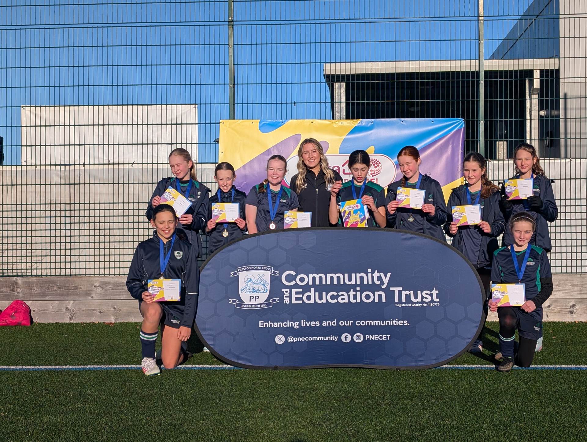 On Thursday, 20th November, the girls’ U13 football team played in the annual Utilita Girls Cup, hosted by Preston North End at Bamber Bridge Sports Hub. The girls were not hampered by the freezing conditions and after playing 7 matches in a round robin league format, Broughton finished in 2nd place, booking a place in the semi final against 3rd placed Penwortham Priory Academy. Broughton put in an excellent performance, winning the semi final 3-0 with goals coming from Louisa Kitchen, Darcey Skelton and Hannah Kelly.